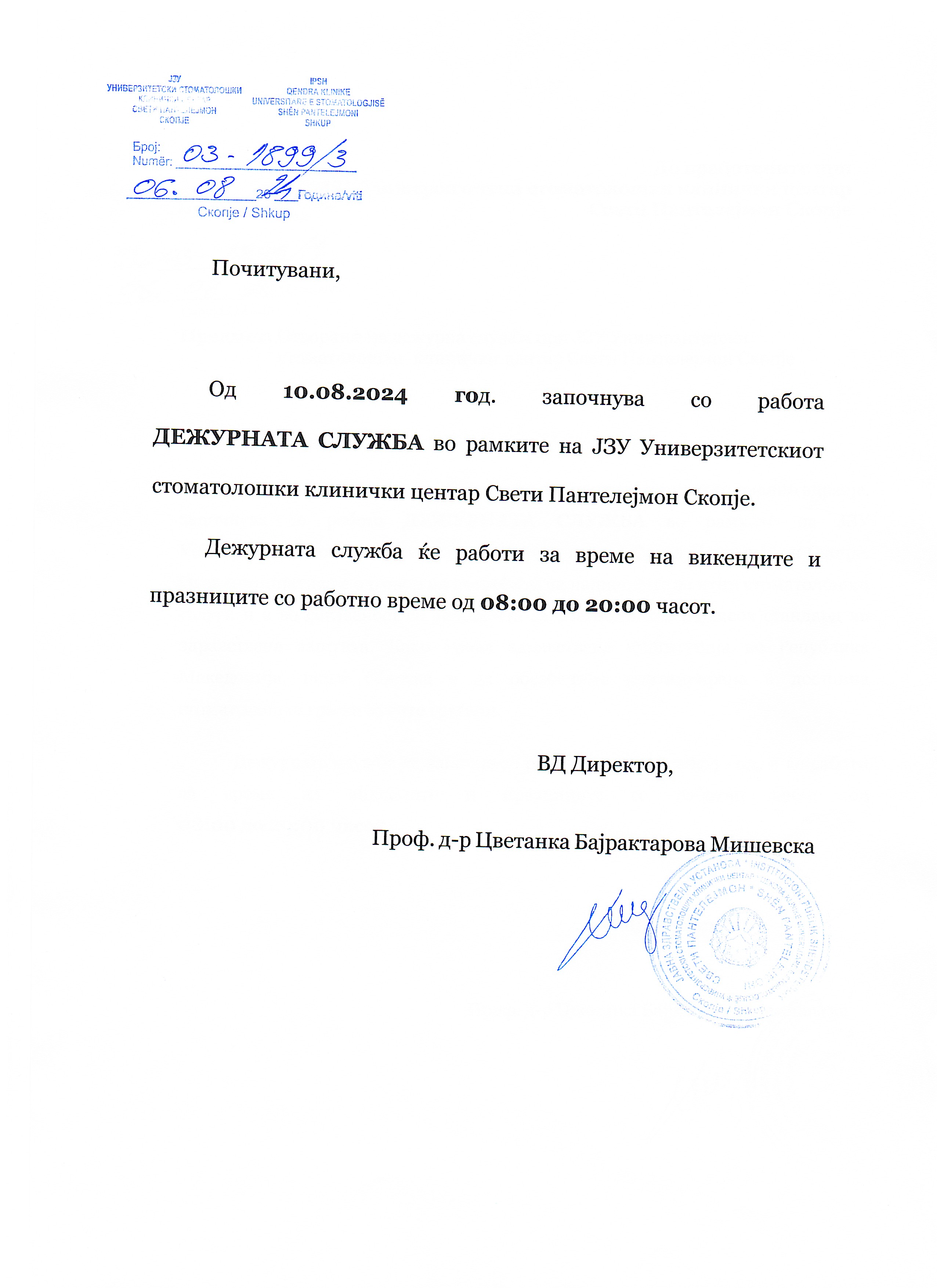 Од 10.08.2024 год. започнува со работа ДЕЖУРНАТА СЛУЖБА